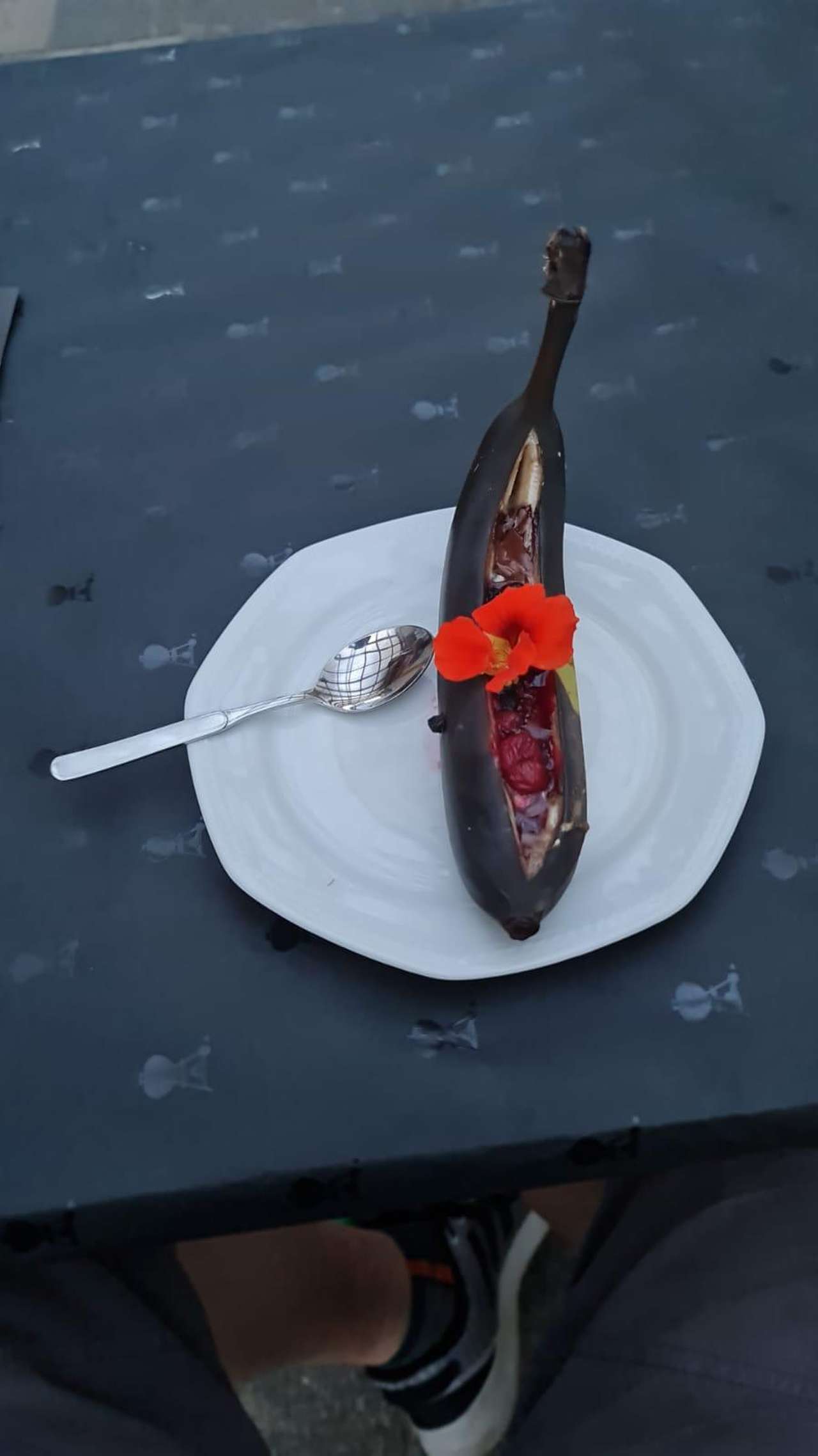 Auch das Dessert wird natürlich wieder gegrillt. Marcus schneidet einen Schlitz in eine Banane (mit Schale) und füllt diesen mit Kinderriegel und gefrorenen Beeren. Nach 10 Minuten Grillzeit ist die Banane weich, die Schokolade geschmolzen und die Bananen können ausgelöffelt werden. Damit endet nach 3,5 Stunden der informative und kulinarische Grillabend bei den Eckhardts.