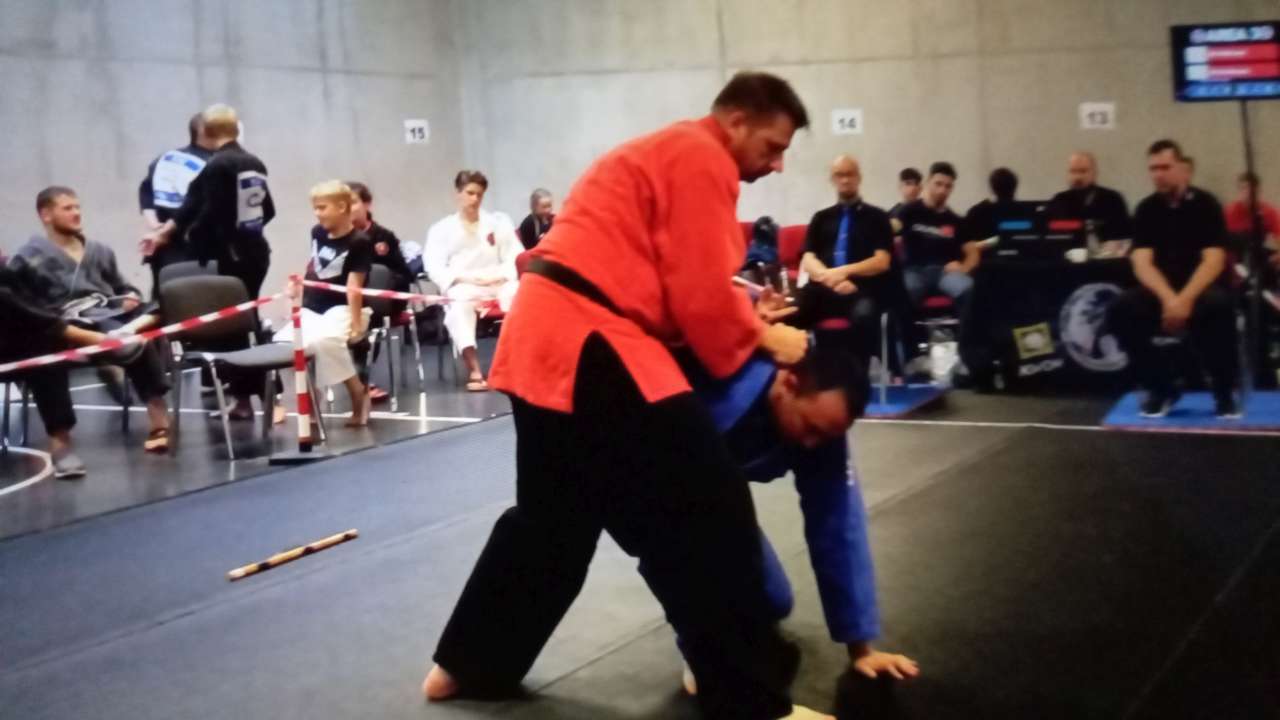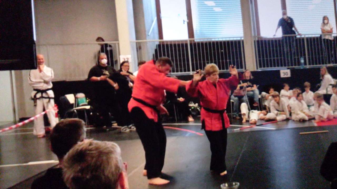 Als erstes mussten sich Ralph und Dagmar bei der realistischen Selbstverteidigung behaupten. Während  Dagmar gewohnt souverän ihr Können zeigte und den ersten Platz holte, tat sich Ralph im hochkarätigen Teilehmerfeld  schwer, erreichte in seiner Gruppe aber dennoch einen verdienten 4.Platz.
